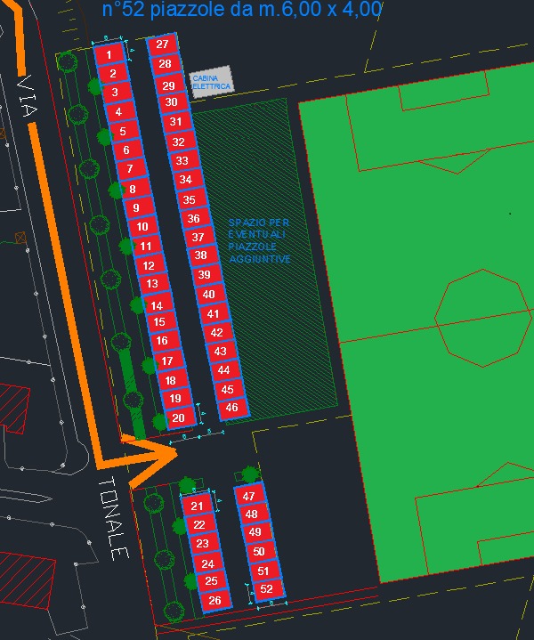L'area camper è situata nel parcheggio di via Adamello a Bellusco: per visualizzare la posizione rispetto alla pista clicca qui. Per la disposizione delle piazzole vedi la mappa riportata qui sotto: sotto la mappa sarà visibile il prospetto che indica i posti disponibili.